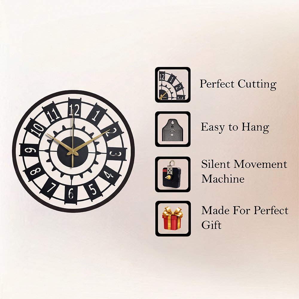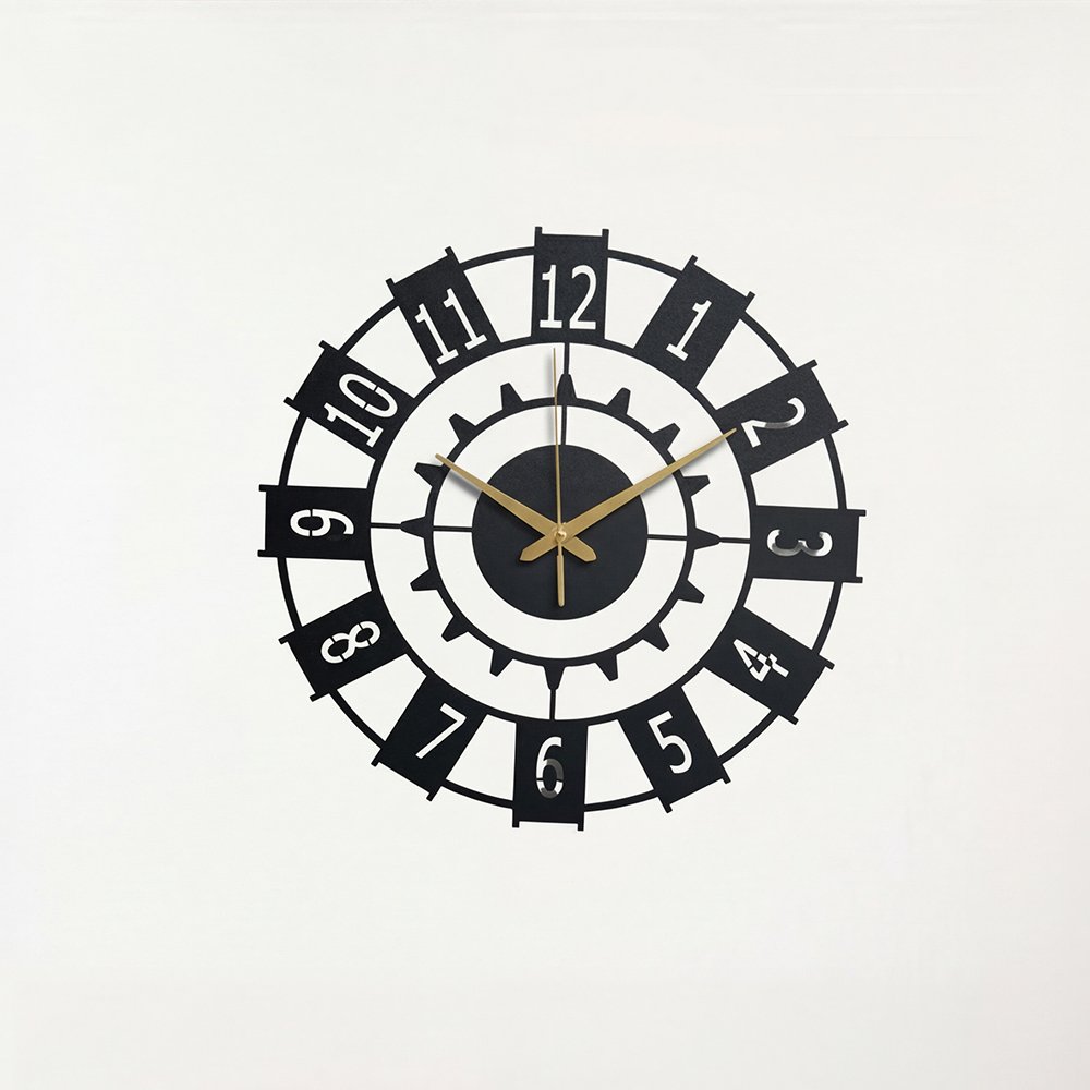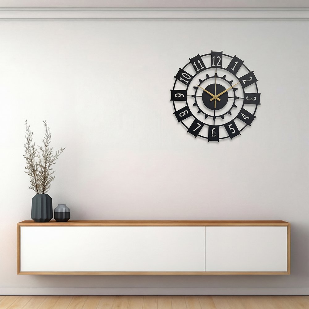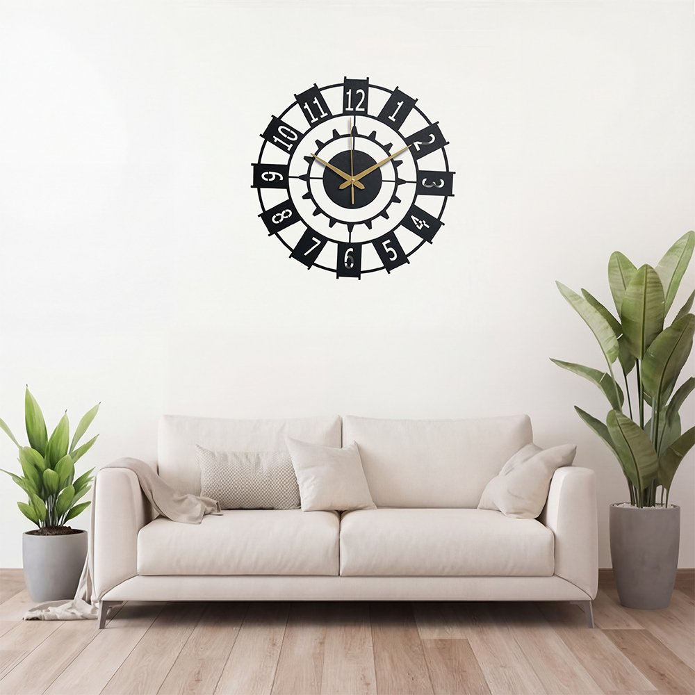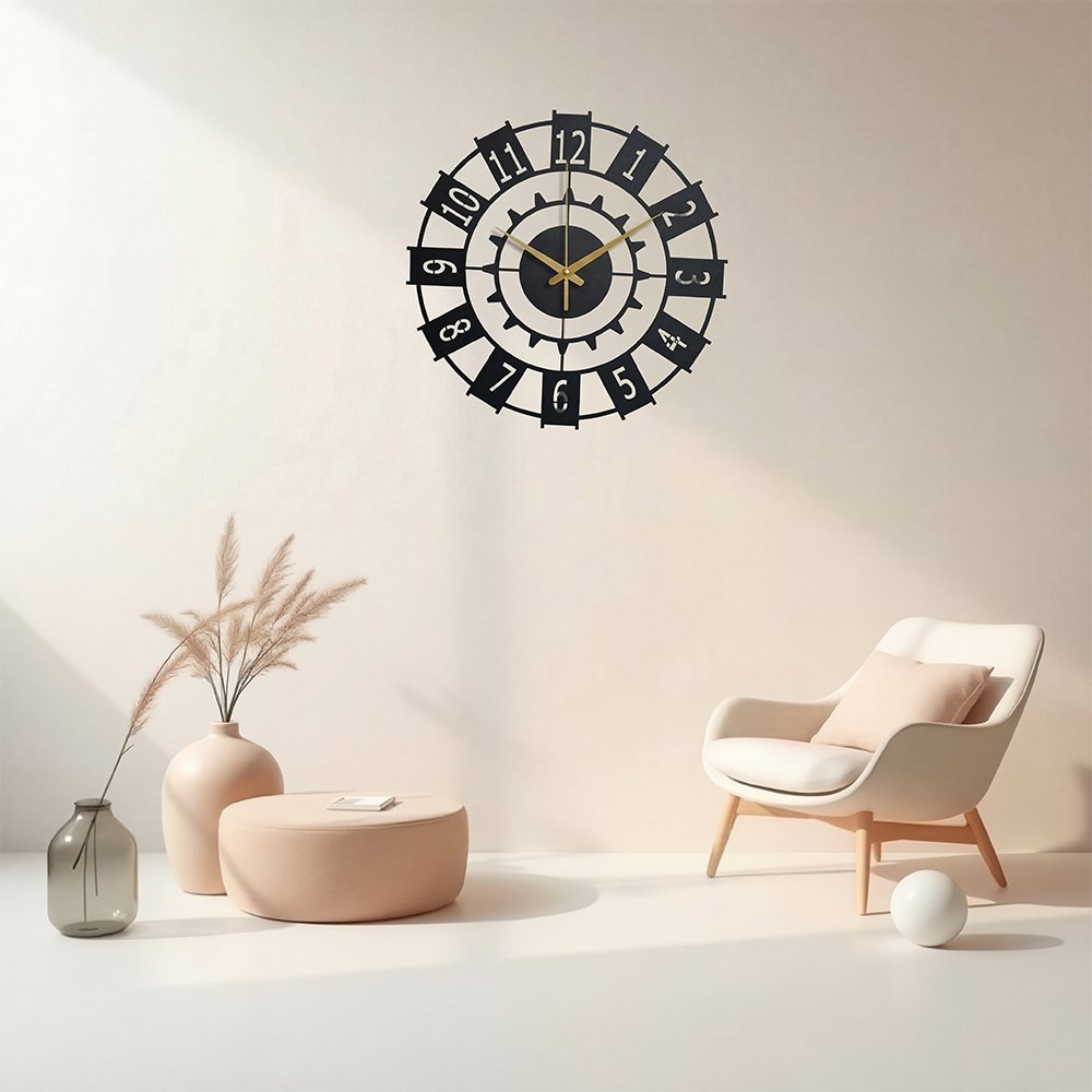 Elevate your space with the Chrona Gear Metal Wall Clock, a refined blend of modern minimalism and timeless elegance. Designed with a sleek matte black metal frame, bold numeric markers, and champagne-gold hands, this statement wall clock adds a touch of quiet luxury to any interior.
